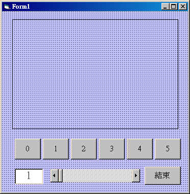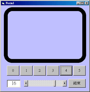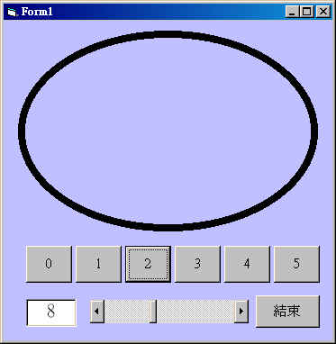Form1 : 調整表單視窗的大小,使Width和Height合乎適當大小。 Shape1 : Shape = 1,矩形。 Hscroll1: Max = 20; Min = 1 Text1 : Text = "1" Command1(0):Caption = "0" Command1(1):Caption = "1" Command1(2):Caption = "2" Command1(3):Caption = "3" Command1(4):Caption = "4" Command1(5):Caption = "5" |