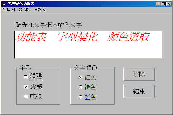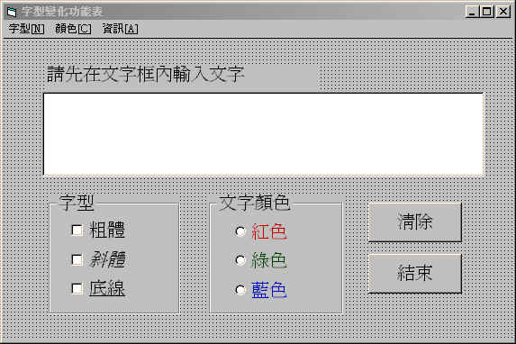Label(標籤)................ 1 件 TextBox(文字框)............ 1 件 Frame(框架)................ 2 件 Line....................... 1 件 CheckBox................... 3 件 OptionButton............... 3 件 Command Button............. 2 件 VB.Menu(功能表) |